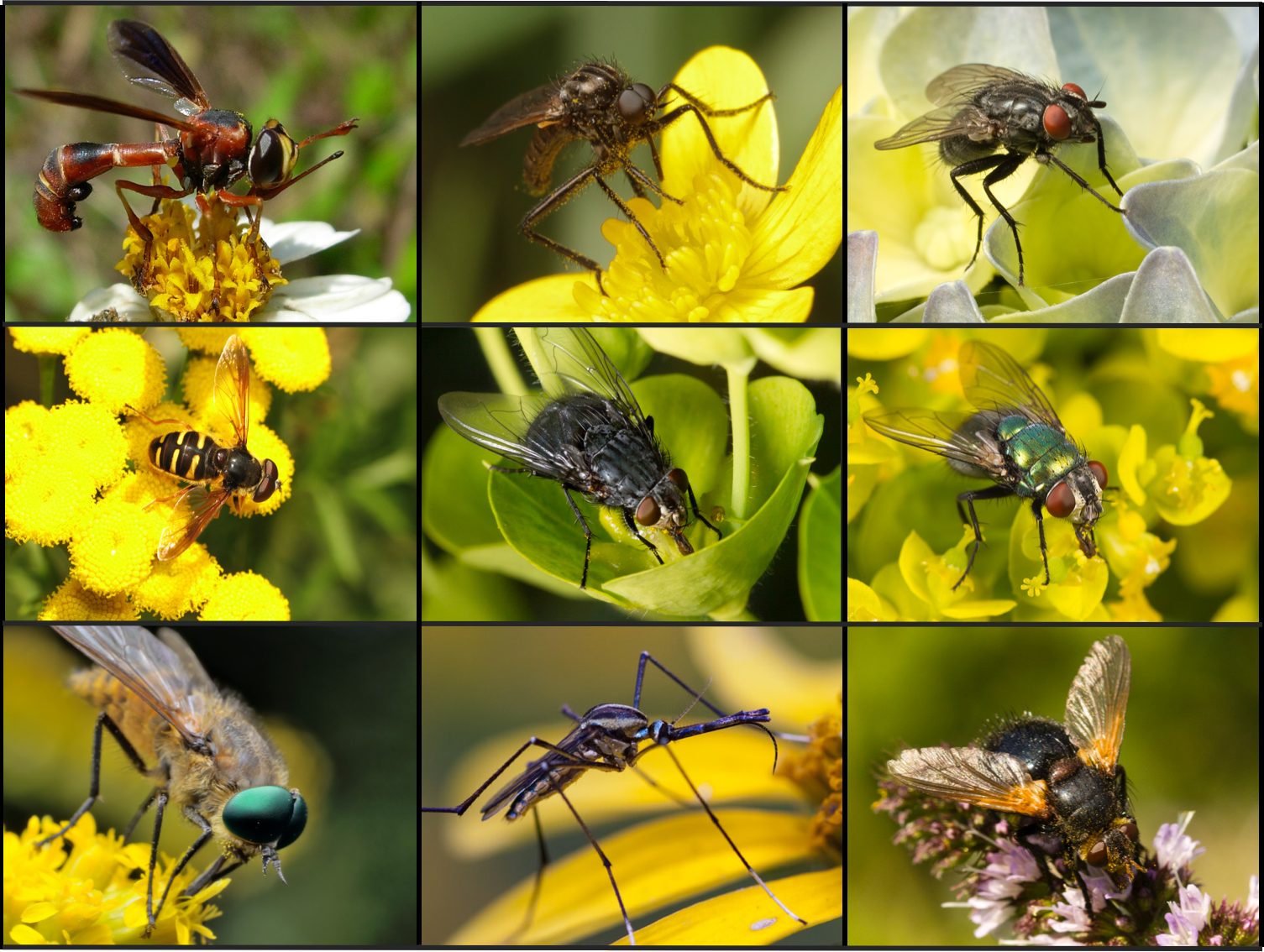Fly pollinators: left to right, top – thick headed fly (Conopidae), dagger fly (Empididae), flesh fly (Sarcophagidae); middle – flower fly or hover fly (Syrphidae), blow fly (Calliphoridae), blow fly (Calliphoridae); bottom – horse fly (Tabanidae), mosquito (Culicidae), bee-like fly (Tachinidae) [Photo: Sean McCann