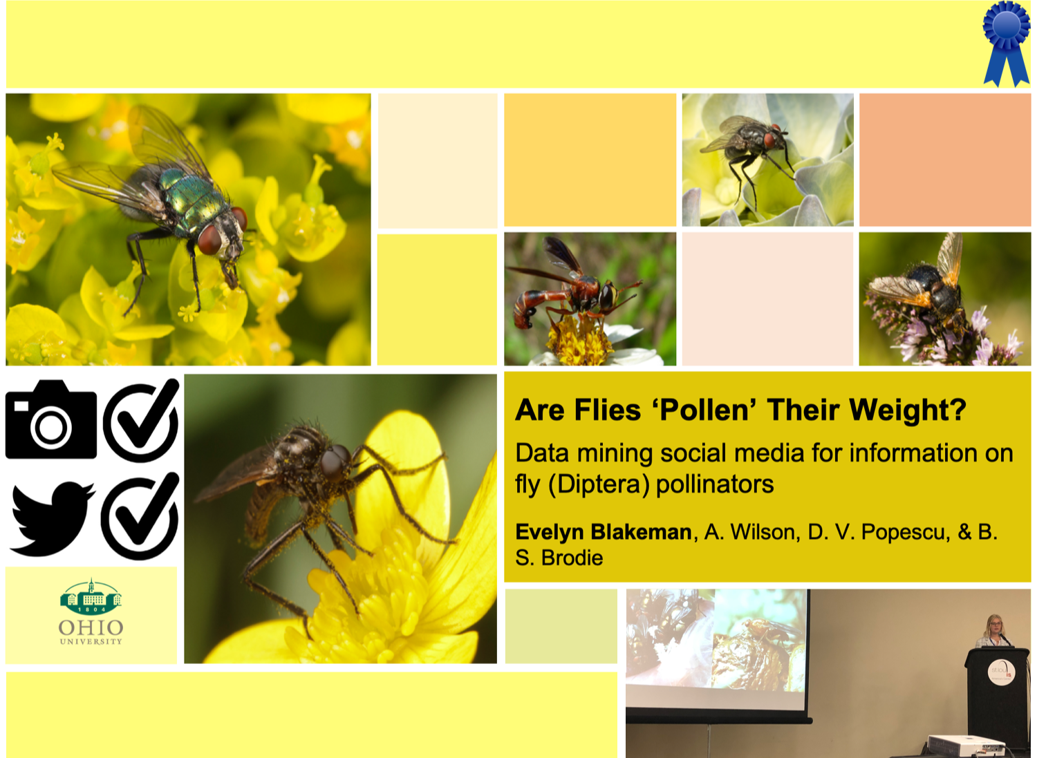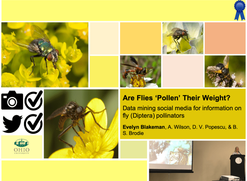 Evelyn Blakeman*, Ayden B. Wilson*, V. Popescu, and B.S. Brodie. Are flies pollen their weight? Data mining social media for information on fly (Diptera) pollinators. Pollinator-Insect Ecology (P-IE) Undergraduate Research Symposium- Entomological Society of America. St. Louis, MI, 17-10 November 2019. 1st Place Oral Presentation Award