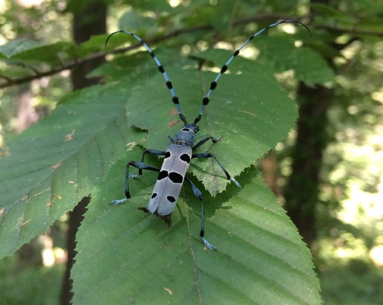 What is a longicorn beetle? A longicorn beetle, or long horned beetle, (Family Cerambycidae) is a species of beetle typically with (as you might have already guessed) very long antenna. Often, the antenna are one and a half times the size of their body. There are over 20,000 of these beetles described worldwide. The larva (or immature stage) of the beetle can often be found boring through wood where they develop and pupate. Many species in this family are considered pests because of the damage they cause to lumber (nobody wants wood with holes when building a house). But these beetles are just doing their job, recycling wood, which is an important ecosystem service! As nature’s recyclers, longicorn beetles are the ideal biological indicator for forest health, and can be used as conservation surrogates for other forest species of conservation concern. It’s because they are such good recyclers of trees that the line between “damage’ and “ecosystem service” can be gray, causing the conservation of these beetles to be tricky.
